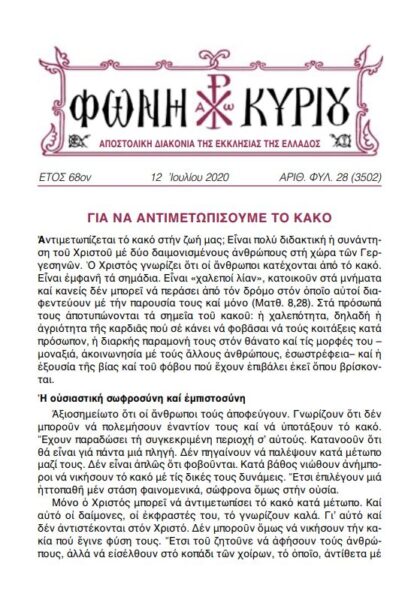 ΔΙΑΒΑΣΤΕ ΔΙΑΔΙΚΤΥΑΚΑ τη Φωνή Κυρίου της Αποστολικής Διακονίας της Εκκλησίας της Ελλάδος – ΚΥΡΙΑΚΗ Ε’ ΜΑΤΘΑΙΟΥ – όπως αυτή διεμοιράσθη σε όλους τους ιερούς ναούς της ελληνικής επικράτειας, αλλά και του εξωτερικού, κατά την 12η Ιουλίου 2020.