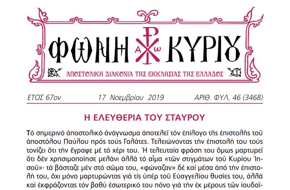 ΔΙΑΒΑΣΤΕ ΕΔΩ τη “ΦΩΝΗ ΚΥΡΙΟΥ” της 17ης Νοεμβρίου 2019 της Αποστολικής Διακονίας της Εκκλησίας της Ελλάδος, καθώς αυτή διεμοιράσθη σε όλους τους ιερούς ναούς της ελληνικής επικράτειας.
