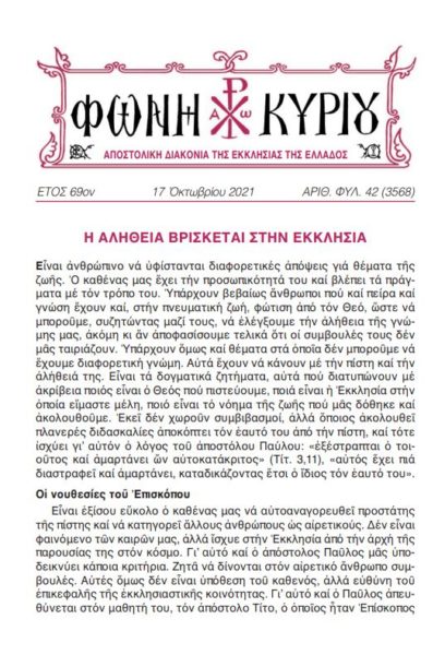 Εκκλησία της Ελλάδος 17 Οκτωβρίου, 2021 Η «Φωνή Κυρίου» της 17ης Οκτωβρίου Διαδώστε: ΔΙΑΒΑΣΤΕ ΔΙΑΔΙΚΤΥΑΚΑ τη “Φωνή Κυρίου” της Αποστολικής Διακονίας της Εκκλησίας της Ελλάδος – ΚΥΡΙΑΚΗ Δ’ ΛΟΥΚΑ – όπως αυτή διεμοιράσθη σε όλους τους ιερούς ναούς της ελληνικής επικράτειας, αλλά και του εξωτερικού, κατά την 17η Οκτωβρίου 2021. Διαδώστε:
