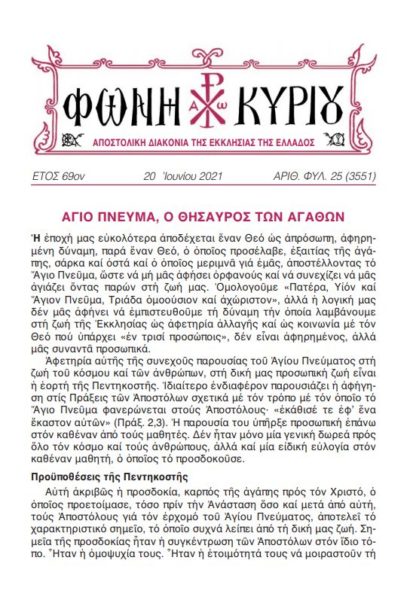 ΔΙΑΒΑΣΤΕ ΔΙΑΔΙΚΤΥΑΚΑ τη “Φωνή Κυρίου” της Αποστολικής Διακονίας της Εκκλησίας της Ελλάδος – ΚΥΡΙΑΚΗ Η’ ΑΠΟ ΤΟΥ ΠΑΣΧΑ, Η ΕΟΡΤΗ ΤΗΣ ΠΕΝΤΗΚΟΣΤΗΣ – όπως αυτή διεμοιράσθη σε όλους τους ιερούς ναούς της ελληνικής επικράτειας, αλλά και του εξωτερικού, κατά την 20η Ιουνίου 2021.