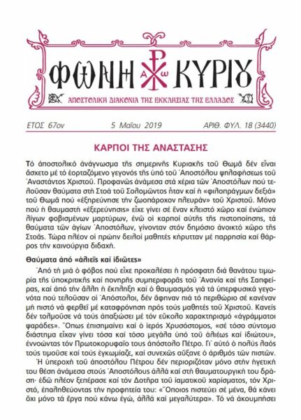 Διαβάστε ΕΔΩ τη “ΦΩΝΗ ΚΥΡΙΟΥ” της Αποστολικής Διακονίας της Εκκλησίας της Ελλάδος, όπως αυτή διαμοιράστηκε κατά την Κυριακή 5 Μαΐου 2019 – ΤΟΥ ΘΩΜΑ – στους Ιερούς Ναούς ολόκληρης της ελληνικής επικράτειας.