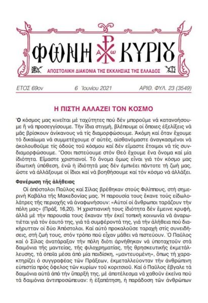 Εκκλησία της Ελλάδος 06 Ιουνίου, 2021 Η “Φωνή Κυρίου” της Κυριακής του Τυφλού Διαδώστε: ΔΙΑΒΑΣΤΕ ΔΙΑΔΙΚΤΥΑΚΑ τη “Φωνή Κυρίου” της Αποστολικής Διακονίας της Εκκλησίας της Ελλάδος – ΚΥΡΙΑΚΗ ΣΤ’ ΑΠΟ ΤΟΥ ΠΑΣΧΑ – όπως αυτή διεμοιράσθη σε όλους τους ιερούς ναούς της ελληνικής επικράτειας, αλλά και του εξωτερικού, κατά την 6η Ιουνίου 2021. Διαδώστε: