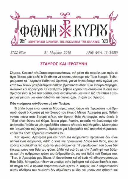Διαβάστε ΕΔΩ τη “ΦΩΝΗ ΚΥΡΙΟΥ” της Αποστολικής Διακονίας της Εκκλησίας της Ελλάδος της Κυριακής 31ης Μαρτίου 2019 (της Σταυροπροσκυνήσεως), όπως αυτή διαμοιράστηκε στους ιερούς ναούς ολόκληρης της χώρας.