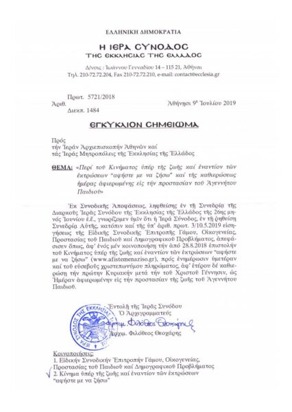 Παρακάτω παραθέτουμε τη σχετική απόφαση της Ιεράς Συνόδου της Εκκλησίας της Ελλάδος όπως αυτή έχει δημοσιευτεί στην επίσημη σελίδα του Κινήματος “Αφήστε με να ζήσω”.
