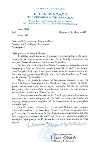 Η Ιερά Σύνοδος της Εκκλησίας της Ελλάδος απέστειλε στον Σεβασμιώτατο Μητροπολίτη Λαρίσης και Τυρνάβου επιστολή συμπαράστασης με αφορμή τους πρόσφατους σεισμούς που έπληξε την Μητροπολιτική περιφέρεια με επίκεντρο την Ελασσόνα.