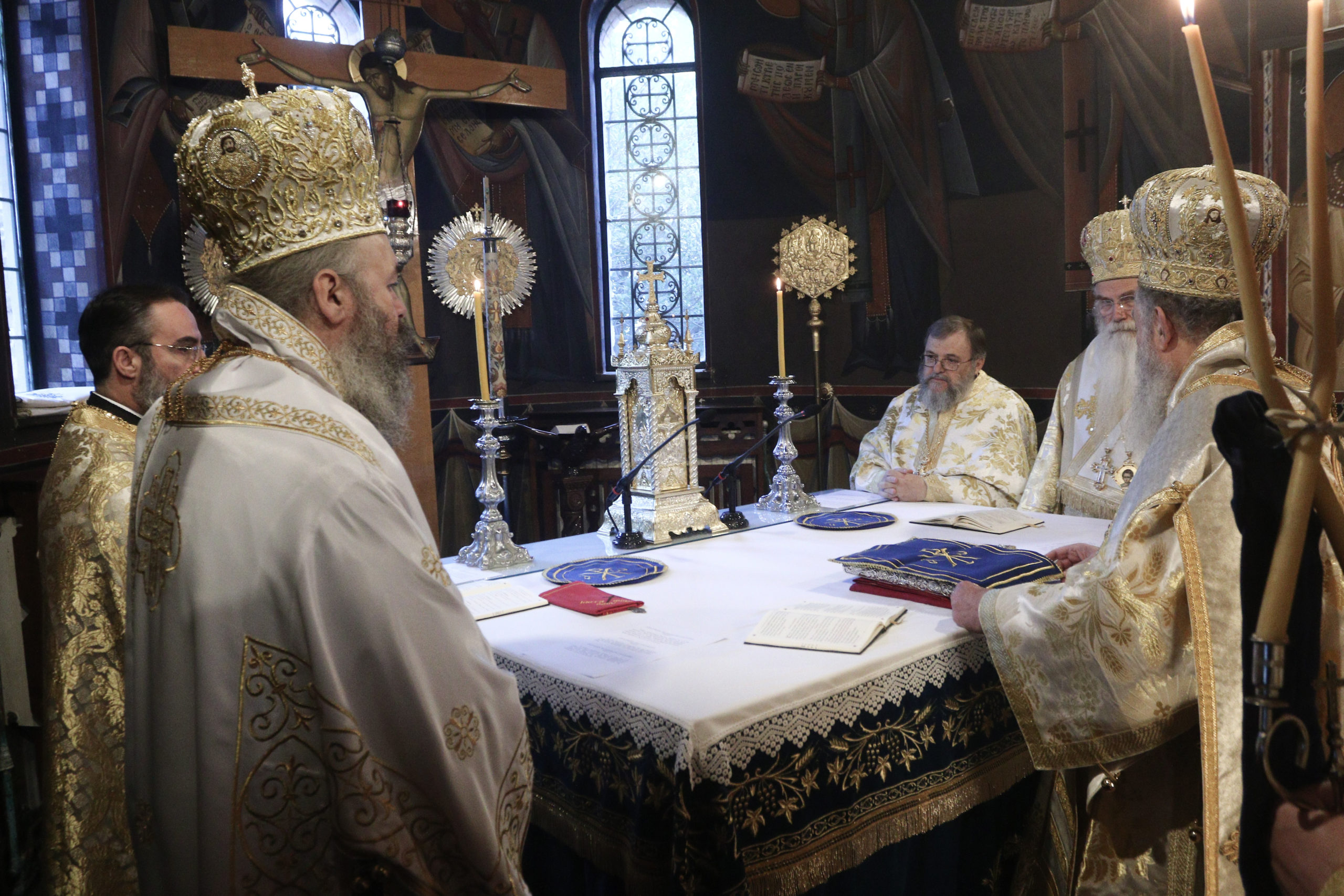 Στο Καθολικό της Μονής τελέστηκε συλλείτουργο από τους ορισθέντες υπό της Διαρκούς Ιεράς Συνόδου Σεβασμιωτάτους Μητροπολίτες Χαλκίδος κ. Χρυσόστομο, Μεσογαίας και Λαυρεωτικής κ. Νικόλαο και Φλωρίνης, Πρεσπών και Εορδαίας κ. Ειρηναίο.