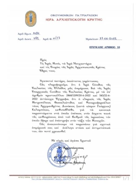 Η Ιερά Σύνοδος της Εκκλησίας της Ελλάδος επέβαλε πρόσφατα την εσχάτη των ποινών για ιερωμένο, αυτήν της καθαιρέσεως από τον βαθμό της ιεροσύνης, στον μέχρι τώρα Αρχιμανδρίτη Διονύσιο (κατά κόσμον Γεώργιο) Καλαμπόκα (της Ιεράς Μητροπόλεως Θεσσαλιώτιδος και Φαναριοφερσάλων), εξαιτίας κανονικών παραπτωμάτων στα οποία υπέπεσε, επαναφέροντάς τον στην τάξη των Μοναχών. Η είδηση έγινε γνωστή μέσα από μια εγκύκλιο του Αρχιεπισκόπου Κρήτης κ. Ευγενίου (22ας Ιουνίου 2022) προς τους Μοναχούς και τις Μοναχές της Αρχιεπισκοπής Κρήτης, η οποία έχει ως εξής: