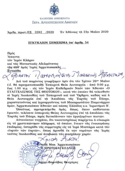 Κατά την εσπέρα της Τρίτης 26ης Μαϊου, η Ιερά Αρχιεπισκοπή Αθηνών καλεί τις Ενορίες σε τέλεση ιερών πανηγυρικών, αναστάσιμων Αγρυπνιών και Εσπερινών Θείων Λειτουργιών για την Απόδοση του Πάσχα, ώστε, ο ευσεβής λαός που στερήθηκε τη χαρά της Αναστάσεως, να νιώσει και φέτος ότι τελικώς δεν στερήθηκε τα νάματα της κορυφαίας Εορτής των Εορτών της Ορθοδοξίας μας.
