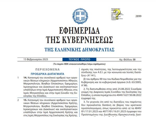 Ωστόσο, εκκρεμούσε η έκδοση του Προεδρικού Διατάγματος η οποία ορίζει την κατανομή του συνολικού αριθμού των οργανικών θέσεων κληρικών. Η υπογραφή από την Πρόεδρο της Δημοκρατίας, Κατερίνα Σακελλαροπούλου, μπήκε στις 9 Φεβρουαρίου 2023 με την απόφαση να δημοσιεύεται στο Φύλλο Εφημερίδος της Κυβερνήσεως (ΦΕΚ) να εκδίδεται την Τετάρτη 15 Φεβρουαρίου και λόγω σφάλματος να επανεκτυπώνεται την επόμενη ημέρα, 16 Φεβρουαρίου.
