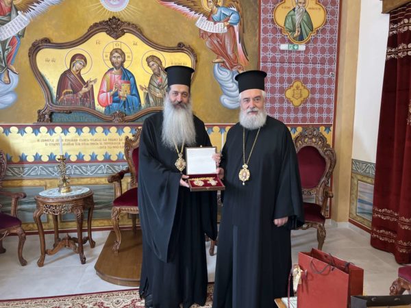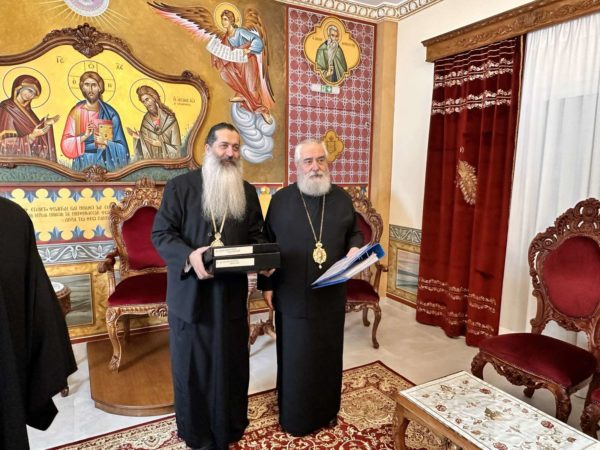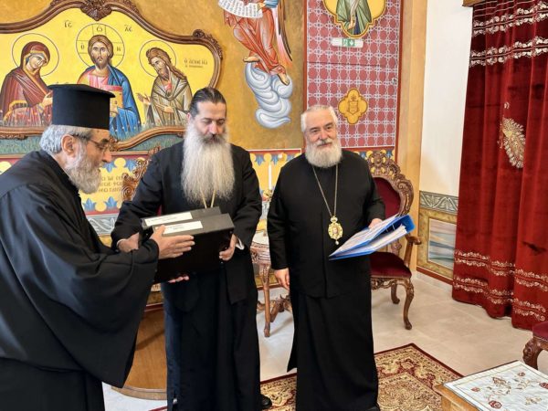 Μετά την επίδοση των φακέλων ακολούθησαν εόρτιες προσρήσεις μεταξύ των δύο ηγαπημένων ιεραρχών, παρατέθηκε αρχοντική δοχή υπό του οικείου Ποιμενάρχου κ. Θεοκτίστου, αντηλλάγησαν και συμβολικά δώρα εις ενθύμησιν της σπουδαίας και ιστορικής αυτής ημέρας και ολοκληρώθηκε η σεμνή αυτή τελετή με τον αμοιβαίο ασπασμό της εν Χριστώ αγάπης.