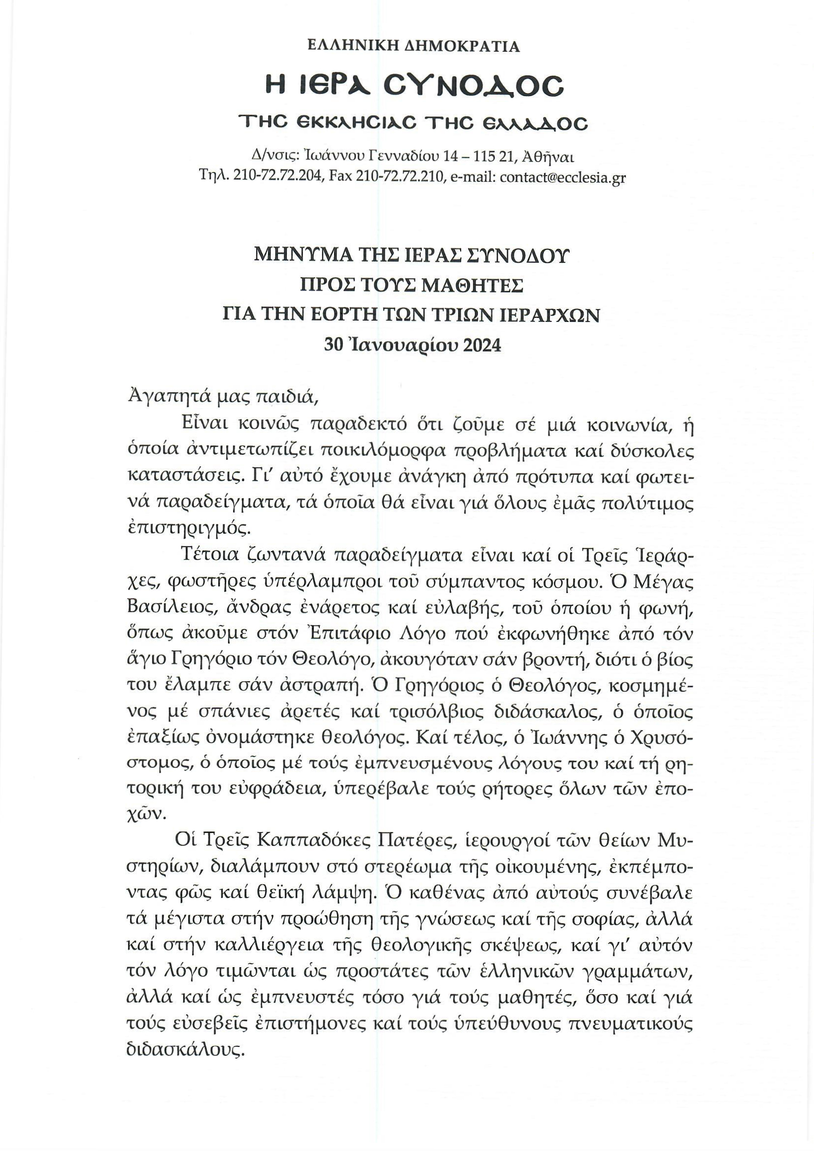 Αναλυτικά το Μήνυμα της Ιεράς Συνόδου της Εκκλησίας της Ελλάδος προς τους μαθητές για την εορτή των Τριών Ιεραρχών 2024: