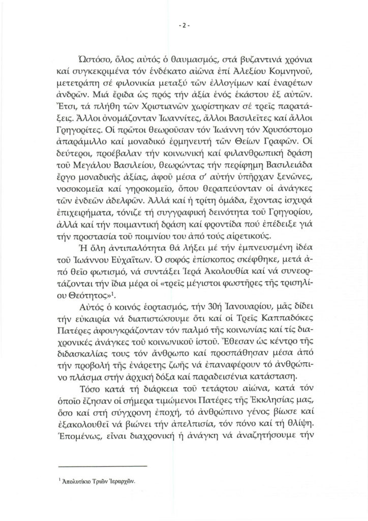 Τέτοια ζωντανά παραδείγματα εἶναι καί οἱ Τρεῖς Ἱεράρχες, φωστῆρες ὑπέρλαμπροι τοῦ σύμπαντος κόσμου. Ὁ Μέγας Βασίλειος, ἄνδρας ἐνάρετος καί εὐλαβής, τοῦ ὁποίου ἡ φωνή, ὅπως ἀκοῦμε στόν Ἐπιτάφιο Λόγο πού ἐκφωνήθηκε ἀπό τόν ἅγιο Γρηγόριο τόν Θεολόγο, ακουγόταν σαν βροντή, διότι ὁ βίος του ἔλαμπε σάν ἀστραπή. Ὁ Γρηγόριος ὁ Θεολόγος, κοσμημένος μέ σπάνιες ἀρετές καί τρισόλβιος διδάσκαλος, ὁ ὁποῖος ἐπαξίως ὀνομάστηκε θεολόγος. Καί τέλος, ὁ Ἰωάννης ὁ Χρυσόστομος, ὁ ὁποῖος μέ τούς ἐμπνευσμένους λόγους του καί τή ρητορική του εὐφράδεια, ὑπερέβαλε τούς ρήτορες ὅλων τῶν ἐποχῶν.
