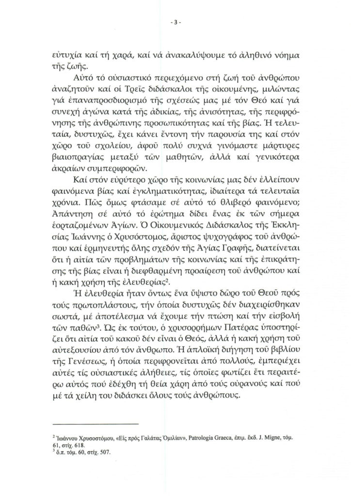 Αὐτό τό ουσιαστικό περιεχόμενο στη ζωή τοῦ ἀνθρώπου ἀναζητοῦν καί οἱ Τρεῖς διδάσκαλοι τῆς οἰκουμένης, μιλώντας γιά ἐπαναπροσδιορισμό της σχέσεώς μας μέ τόν Θεό καί γιά συνεχή αγώνα κατά τῆς ἀδικίας, τῆς ἀνισότητας, τῆς περιφρόνησης τῆς ἀνθρώπινης προσωπικότητας καί τῆς βίας. Ἡ τελευταία, δυστυχῶς, ἔχει κάνει ἔντονη τήν παρουσία της καί στόν χῶρο τοῦ σχολείου, ἀφοῦ πολύ συχνά γινόμαστε μάρτυρες βιαιοπραγίας μεταξύ τῶν μαθητῶν, ἀλλά καί γενικότερα ἀκραίων συμπεριφορῶν.