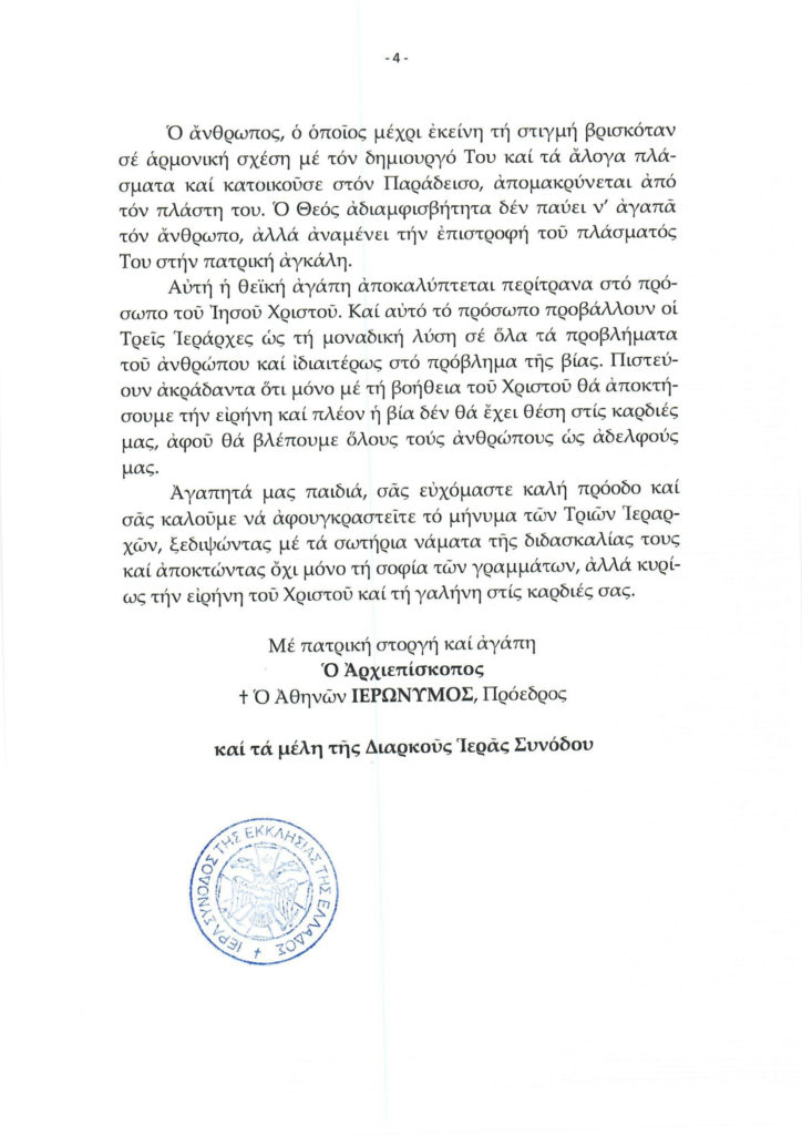 Λαμβάνοντας αφορμή από τον βίο και τις αρετές των Τριών Αγίων των Γραμμάτων, οι οποίοι μιλούσαν για «συνεχή αγώνα κατά τῆς ἀδικίας, τῆς ἀνισότητας, τῆς περιφρόνησης τῆς ἀνθρώπινης προσωπικότητας καί τῆς βίας», η Ιερά Σύνοδος τονίζει ότι τον τελευταίο καιρό η βία «ἔχει κάνει ἔντονη τήν παρουσία της καί στόν χῶρο τοῦ σχολείου».