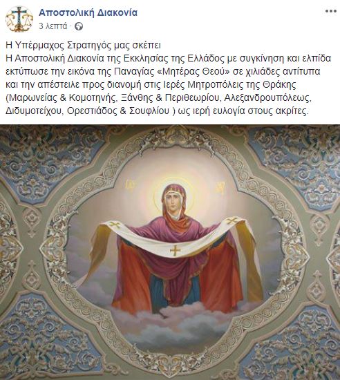 Η Αποστολική Διακονία της Εκκλησίας της Ελλάδος με συγκίνηση και ελπίδα εκτύπωσε την εικόνα της Παναγίας «Μητέρας Θεού» σε χιλιάδες αντίτυπα και την απέστειλε προς διανομή στις Ιερές Μητροπόλεις της Θράκης (Μαρωνείας & Κομοτηνής, Ξάνθης & Περιθεωρίου, Αλεξανδρουπόλεως, Διδυμοτείχου, Ορεστιάδος & Σουφλίου ) ως ιερή ευλογία στους ακρίτες.