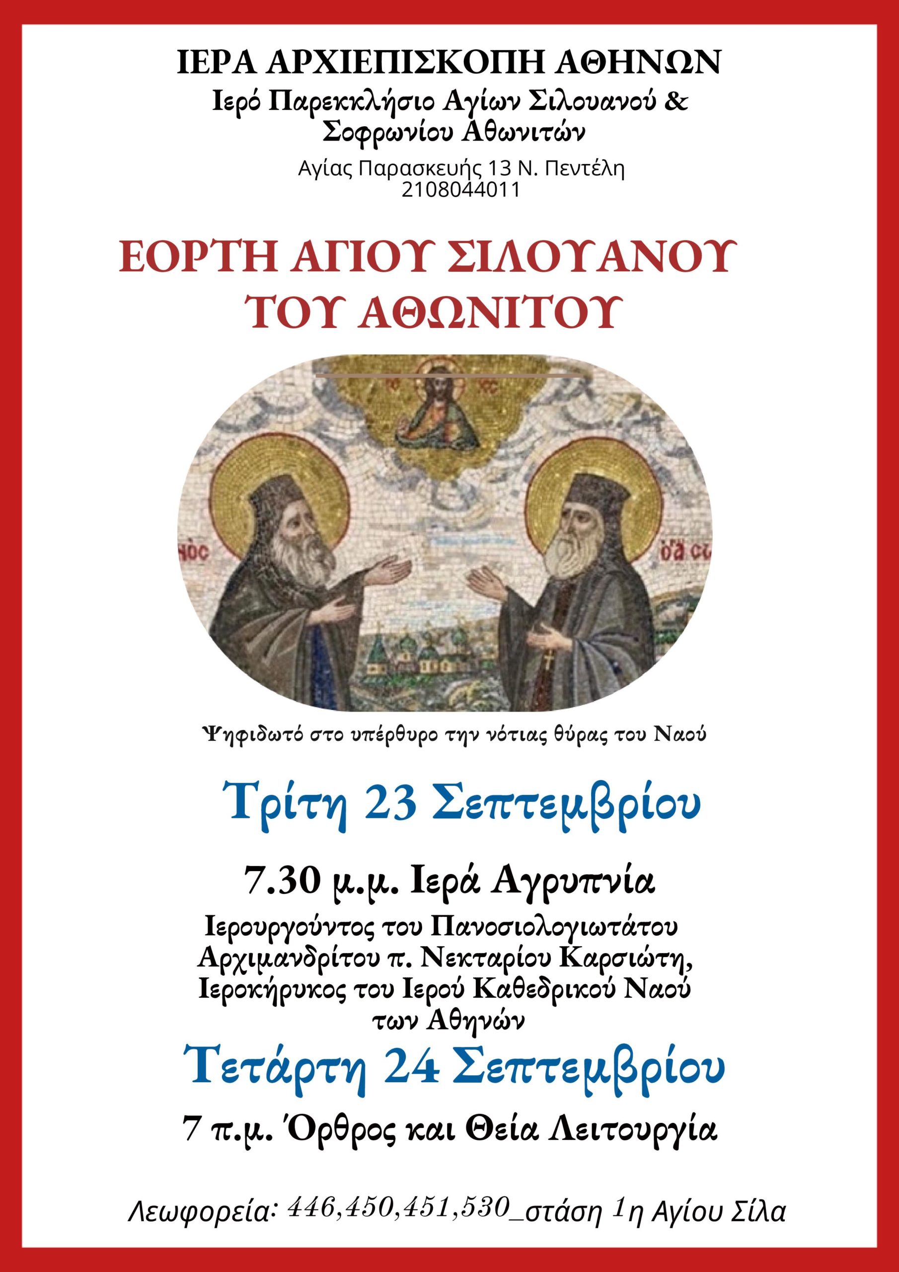 Την Τρίτη 23 Σεπτεμβρίου θα τελεστεί Ιερά Αγρυπνία Αγίου Σιλουανού ιερουργούντος του Αρχιμανδρίτη π. Νεκταρίου Καρσιώτη, Ιεροκήρυκος του Ιερού Ναού Καθεδρικού Ναού των Αθηνών, στον Ι.Ν. Αγίας Παρασκευής Νέας Πεντέλης.