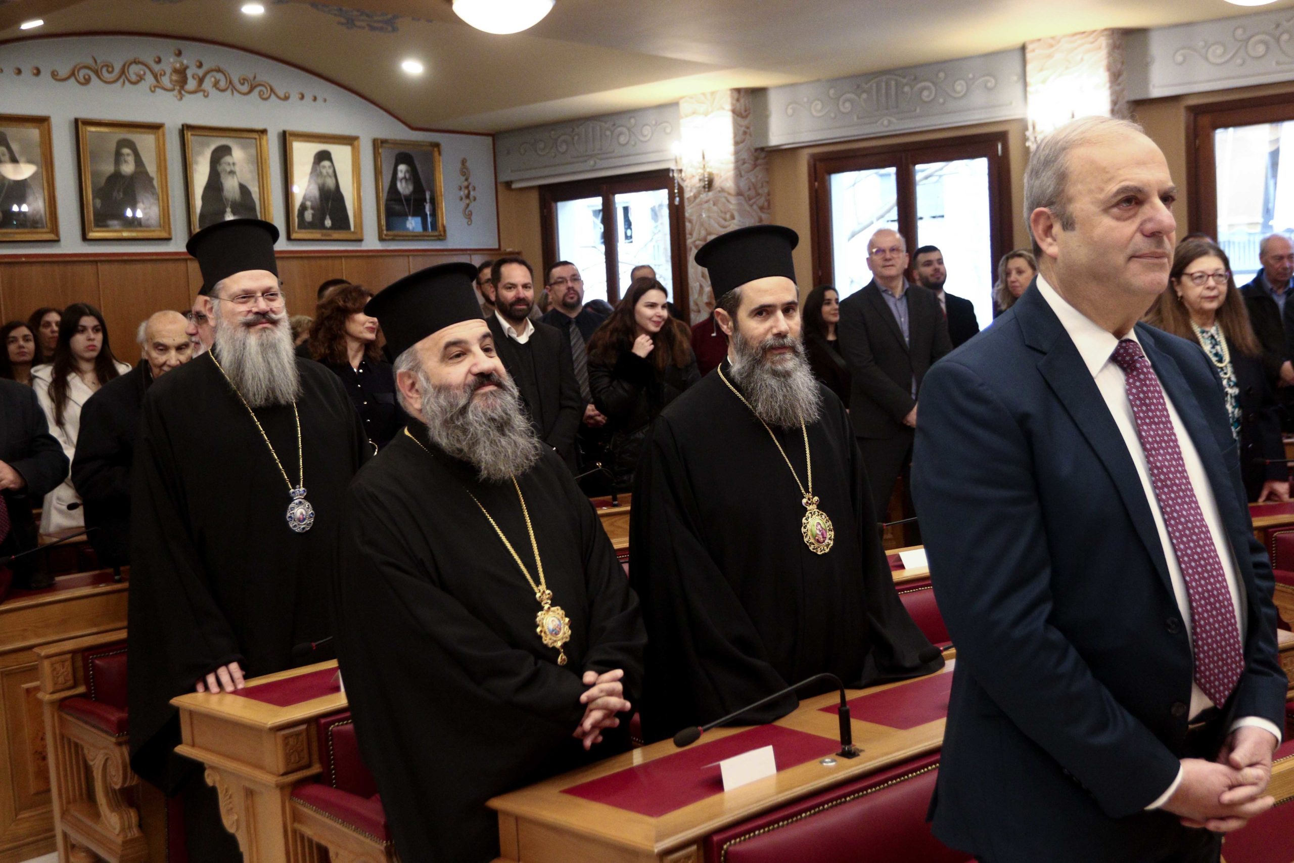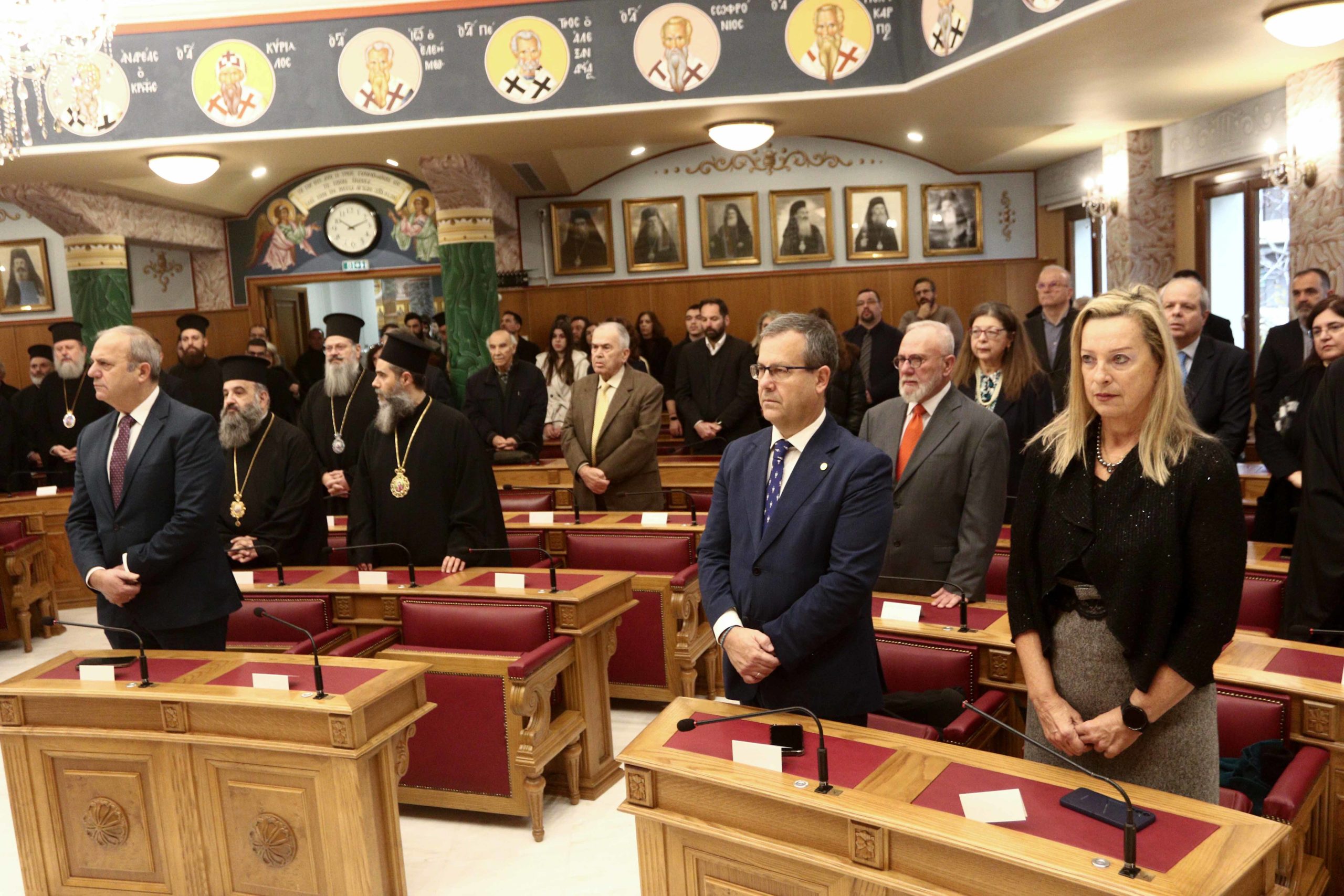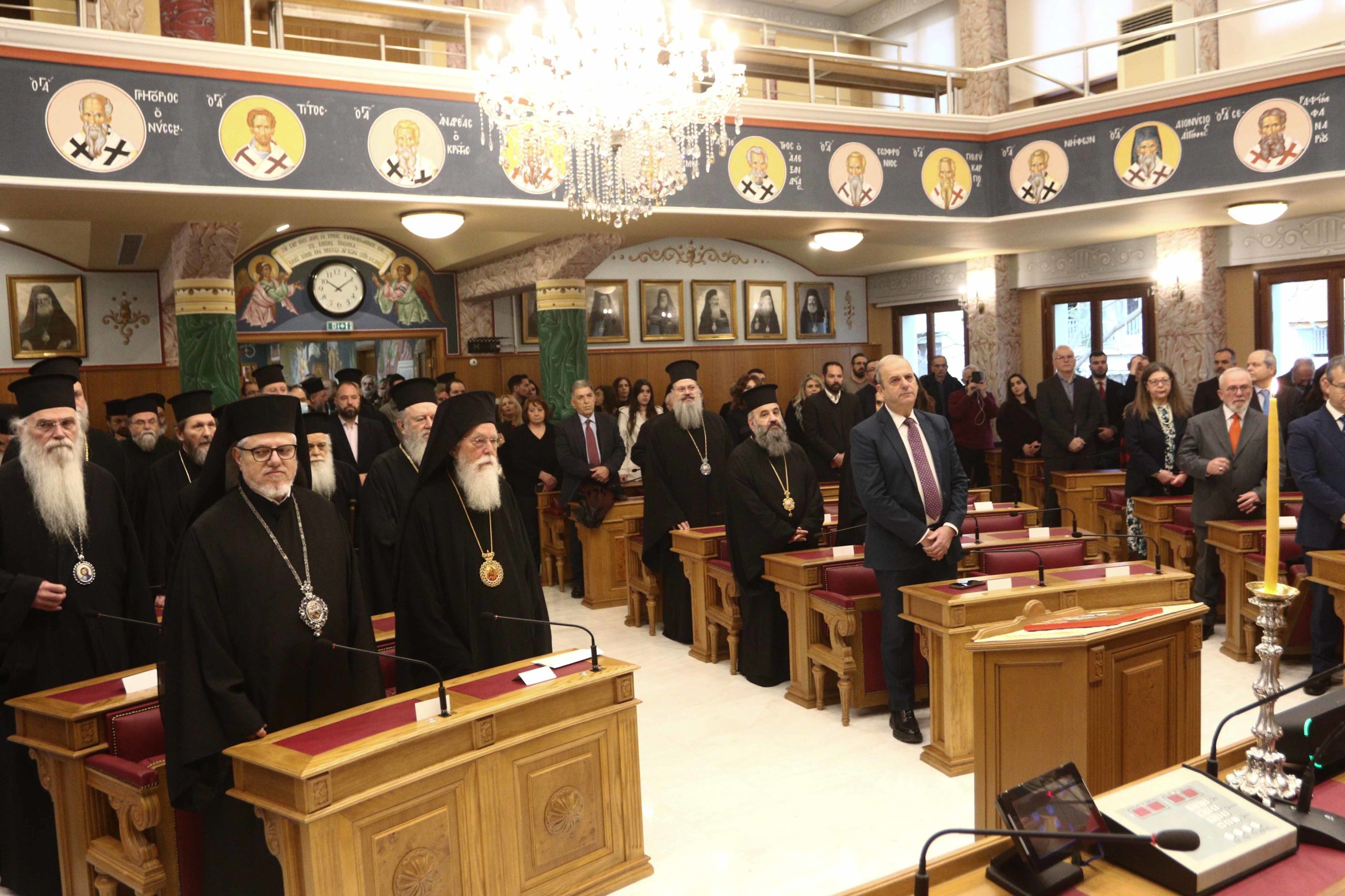 Παρευρέθησαν ο Εκπρόσωπος του Γραφείου του Οικουμενικού Πατριαρχείου στην Αθήνα Σεβασμιώτατος Μητροπολίτης Λαοδικείας κ. Θεοδώρητος, ο Εκπρόσωπος του Πατριαρχείου Αλεξανδρείας στην Αθήνα Σεβασμιώτατος Μητροπολίτης Γουινέας κ. Γεώργιος, ο Έξαρχος του Παναγίου Τάφου στην Αθήνα Πανοσιολογιώτατος Αρχιμανδρίτης κ. Ιερώνυμος, ο Επίτροπος της Ιεράς Μονής Σινά στην Αθήνα Πανοσιολογιώτατος Αρχιμανδρίτης κ. Αγαθάγγελος, οι Σεβασμιώτατοι Συνοδικοί Μητροπολίτες Χαλκίδος κ. Χρυσόστομος, Νέας Σμύρνης κ. Συμεών και Μεσογαίας και Λαυρεωτικής κ. Νικόλαος, οι Σεβασμιώτατοι Μητροπολίτες Νικαίας κ. Αλέξιος, Πειραιώς κ. Σεραφείμ, Κηφισίας, Αμαρουσίου, Ωρωπού και Μαραθώνος κ. Κύριλλος, Νέας Ιωνίας, Φιλαδελφείας, Ηρακλείου και Χαλκηδόνος κ. Γαβριήλ, Γλυφάδας, Ελληνικού, Βούλας, Βουλιαγμένης και Βάρης κ. Αντώνιος, Μεγάρων και Σαλαμίνος κ. Κωνσταντίνος, οι Πανιερώτατοι Μητροπολίτες Θερμοπυλών κ. Ιωάννης και Θαυμακού κ. Ιάκωβος, ο Θεοφιλέστατος Αρχιγραμματεύς της Ιεράς Συνόδου της Εκκλησίας της Ελλάδος Επίσκοπος Σκιάθου κ. Ιωάννης, ο Θεοφιλέστατος Πρωτοσύγκελλος της Ιεράς Αρχιεπισκοπής Αθηνών Επίσκοπος Χριστουπόλεως κ. Βαρνάβας, οι Θεοφιλέστατοι Επίσκοποι Χριστιανουπόλεως κ. Προκόπιος, Φωτικής κ. Νεκτάριος, Καρυουπόλεως κ. Νεκτάριος, Επιδαύρου κ. Νικόδημος και Ταλαντίου κ. Θεολόγος, ο Γενικός Αρχιερατικός Επίτροπος της Ιεράς Αρχιεπισκοπής Αθηνών π. Εμμανουήλ Παπαμικρούλης, ο Κοσμήτορας της Θεολογικής Σχολής του Πανεπιστημίου Αθηνών κ. Εμμανουήλ Καραγεωργούδης, ο Πρόεδρος του Τμήματος Θεολογίας της Θεολογικής Σχολής του ΕΚΠΑ κ. Ιωάννης Παναγιωτόπουλος και ο Πρόεδρος του Ακαδημαϊκού Συμβουλίου της Ανωτάτης Εκκλησιαστικής Ακαδημίας Αθηνών κ. Αθανάσιος Καψάλης, Καθηγητές της Θεολογικής Σχολής Αθηνών, Ακαδημαϊκοί, Διευθυντές των Υπηρεσιών και των Οργανισμών της Ιεράς Συνόδου της Εκκλησίας της Ελλάδος, οι Γραμματείς των Συνοδικών Επιτροπών, Κληρικοί και λαϊκοί Υπάλληλοι των Διοικητικών Υπηρεσιών της Ιεράς Συνόδου.