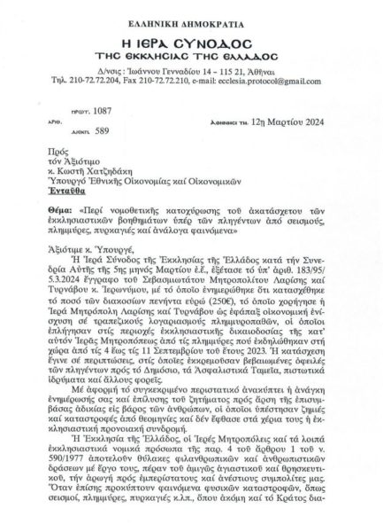 Ιερά Σύνοδος προς Υπουργό Οικονομίας: Κατοχυρώστε νομοθετικά το ακατάσχετο των εκκλησιαστικών βοηθημάτων για φυσικές καταστροφές