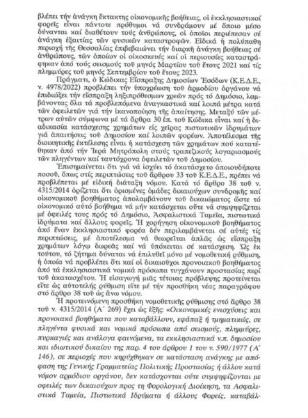 «Ο κομβικός ρόλος της Εκκλησίας στην αρωγή παντί τρόπω των πασχόντων συμπολιτών μας είναι διαχρονικά γνωστός. Δεν λησμονούμε, για παράδειγμα, την πολύτιμη συνεισφορά της στην παροχή βοήθειας στους ανθρώπους που επλήγησαν από την μακρά οικονομική κρίση, συνεπικουρώντας την Πολιτεία, σε πνεύμα έμπρακτης κοινωνικής αλληλεγγύης. Το ίδιο συμβαίνει, συχνά αφανώς, και σε κάθε περίπτωση μεγάλων φυσικών καταστροφών, προς τους πληγέντες. Ως εκ τούτου, δεν είναι ηθικό να κατάσχονται προνοιακά βοηθήματα που δίδονται από Εκκλησιαστικά Ιδρύματα λόγω άλλων χρεών των πληγέντων, όπως συνέβη με το βοήθημα της Μητροπόλεως Λαρίσης και Τυρνάβου στους πλημμυροπαθείς από τον Daniel και τον Elias. Είμαι βέβαιος ότι ο υπουργός Οικονομικών, με την ευαισθησία που τον διακρίνει, θα νομοθετήσει το ακατάσχετο των εκκλησιαστικών βοηθημάτων, σύμφωνα και με την πρόταση της Ιεράς Συνόδου, όπως άλλωστε έγινε με την κρατική αρωγή προς τους πλημμυροπαθείς», αναφέρει, μεταξύ άλλων, στην αναφορά του.
