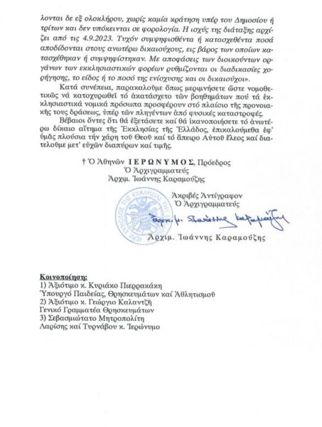 Η επιστολή εστάλη με αφορμή πρωτοβουλία του Μητροπολίτη Λαρίσης και Τυρνάβου κ. Ιερώνυμου ο οποίος με έγγραφο του προς την Ιερά Σύνοδο ενημέρωσε ότι σε τραπεζικούς λογαριασμούς πλημμυροπαθών κατασχέθηκε το ποσό των διακοσίων πενήντα ευρώ, το οποίο χορήγησε η Ιερά Μητρόπολη Λαρίσης και Τυρνάβου ως εφάπαξ οικονομική ενίσχυση σε όσους επλήγησαν στις περιοχές της εκκλησιαστικής της δικαιοδοσίας από τις πλημμύρες του Σεπτεμβρίου του 2023. Η κατάσχεση έγινε λόγω εκκρεμών βεβαιωμένων οφειλών των πληγέντων προς το Δημόσιο, τα Ασφαλιστικά Ταμεία, Τράπεζες και άλλους φορείς.