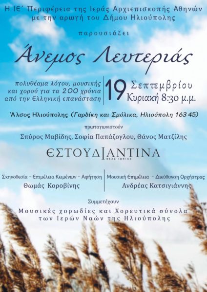 Η 15η Αρχιερατική Περιφέρεια Ηλιούπολης της Ιεράς Αρχιεπισκοπής Αθηνών και οι Ενορίτες της Ηλιούπολης, με την αρωγή του Δήμου Ηλιούπολης, σας προσκαλούν σε ένα πολυθέαμα λόγου, μουσικής και χορού για τα 200 χρόνια από την Ελληνική Επανάσταση με την ΕΣΤΟΥΔΙΑΝΑ Νέας Ιωνίας υπό τη Μουσική Επιμέλεια και Διεύθυνση Ορχήστρας του Ανδρέα Κατσιγιάννη.