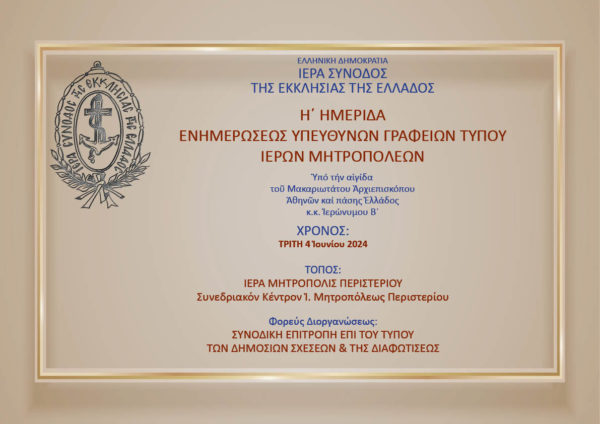 Κατόπιν Συνοδικής Αποφάσεως, ληφθείσης κατά τη Συνεδρία της Διαρκούς Ιεράς Συνόδου της 7ης Μαρτίου 2024, πραγματοποιήθηκε χθες, Τρίτη 4 Ιουνίου 2024, στο Πνευματικό Κέντρο της Ιεράς Μητροπόλεως Περιστερίου, η όγδοη ενημερωτική Ημερίδα για τους Υπευθύνους των Γραφείων Τύπου και τους ασχολουμένους με την επικοινωνία των Ιερών Μητροπόλεων, για τα στελέχη της Ιεράς Αρχιεπισκοπής Αθηνών και των 21 Ιερών Μητροπόλεων των Περιφερειών Αττικής, Βορείου και Νοτίου Αιγαίου.
