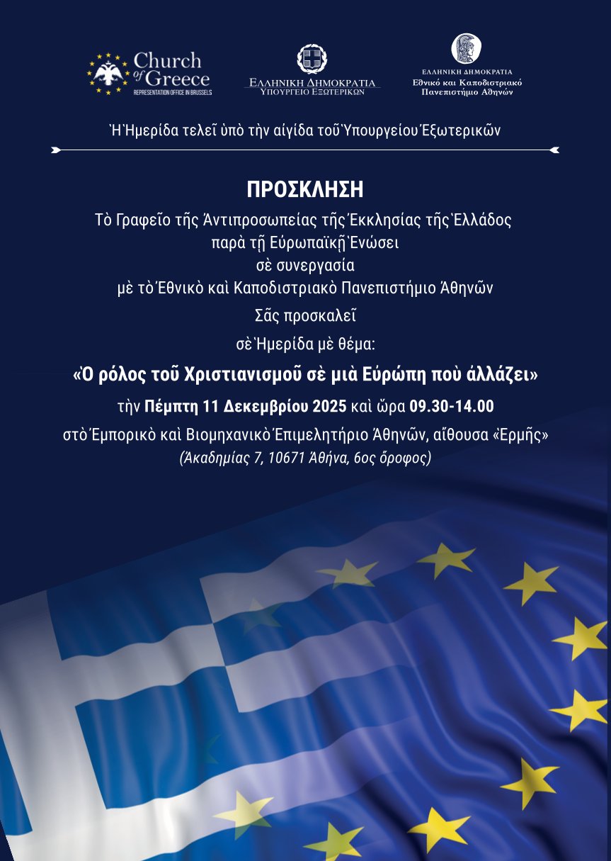 «Ο ρόλος του Χριστιανισμού σε μια Ευρώπη που αλλάζει», είναι το θέμα της ημερίδας που διοργανώνει το Γραφείο της Αντιπροσωπείας της Εκκλησίας της Ελλάδος στην Ευρωπαϊκή Ένωση σε συνεργασία με το Εθνικό Καποδιστριακό Πανεπιστήμιο, αύριο, Πέμπτη, 11 Δεκεμβρίου 2025 στο Εμπορικό και Βιομηχανικό Επιμελητήριο Αθηνών (αίθουσα «Ερμής», Ακαδημίας 7, 09:00-14:00).