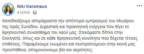 “Καταδικάζουμε απερίφραστα την απόπειρα εμπρησμού του Μεγάρου της Ιεράς Συνόδου. Διχαστική και προκλητική ενέργεια που θίγει το θρησκευτικό συναίσθημα του λαού μας. Στεκόμαστε δίπλα στην Εκκλησία, όπως και σε κάθε θρησκευτική κοινότητα που δέχεται τέτοιες επιθέσεις. Παραμένουμε ενωμένοι και συστρατεύμενοι στην κοινή μας προσπάθεια, απομονώνουμε βία και ακρότητες” αναφέρει, πριν απο λίγο, η Υπουργός Παιδείας και Θρησκευμάτων κα Νίκη Κεραμέως σε μήνυμά της στα κοινωνικά δίκτυα.