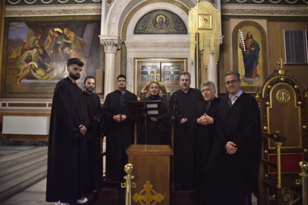 Τους κατανυκτικούς ύμνους απέδωσε ο Χορός καθηγητών και σπουδαστών της Σχολής Βυζαντινής Μουσικής της Ιεράς Αρχιεπισκοπής Αθηνών, υπό τη διεύθυνση του Παν. Αρχιμανδρίτου π. Ειρηναίου Νάκου.