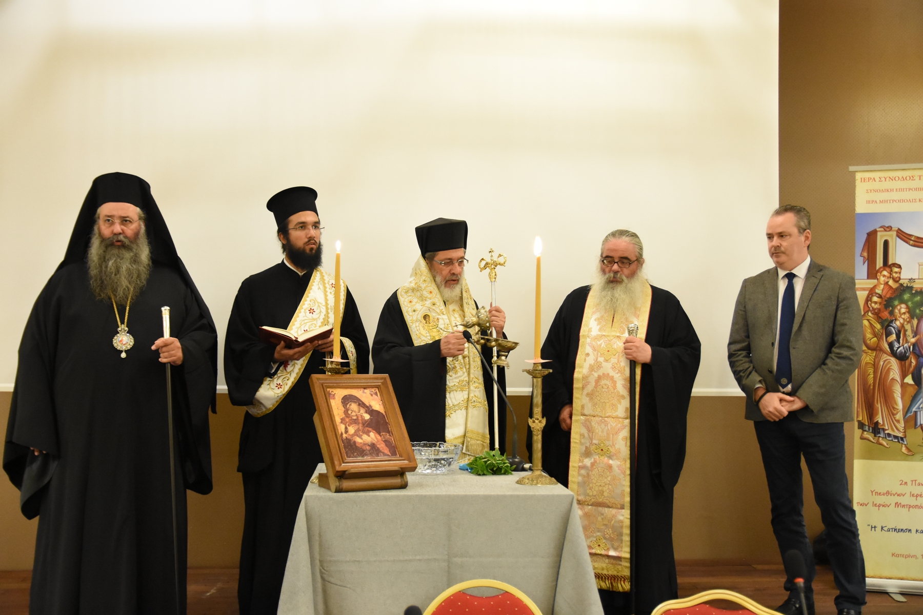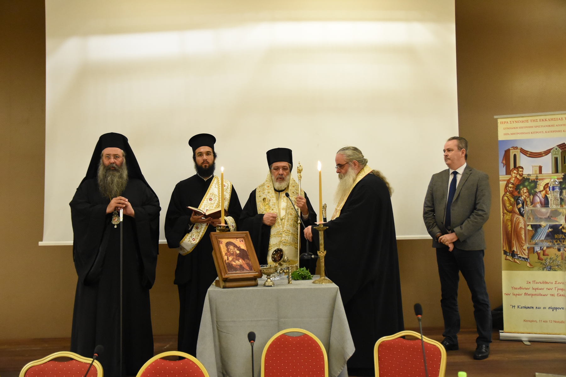 Στην αρχή της πρώτης ημέρας ετελέσθη Αγιασμός και ακολούθησαν οι χαιρετισμοί του Σεβασμιωτάτου κ. Μακαρίου ως Προέδρου της Συνοδικής Επιτροπής, ο οποίος κήρυξε και την έναρξη των εργασιών, του οικείου Μητροπολίτη κ. Γεωργίου καθώς και του Δημάρχου Κατερίνης κ. Κωνσταντίνου Κουκοδήμου που χρηματοδότησε την υλοποίηση του συνεδρίου.