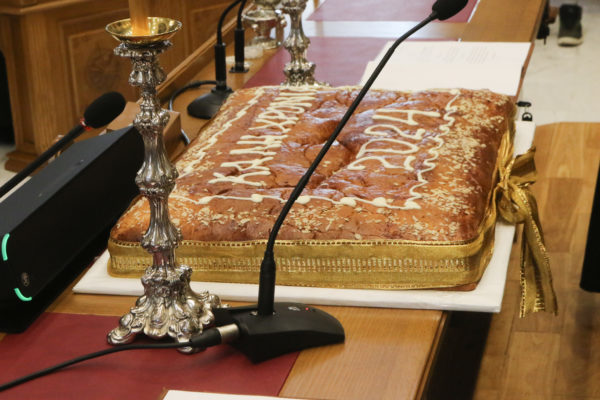 Την καθιερωμένη Βασιλόπιτα ευλόγησε ο Μακαριώτατος Αρχιεπίσκοπος Αθηνών και πάσης Ελλάδος κ.κ. Ιερώνυμος, στην Ιερά Σύνοδο της Εκκλησίας της Ελλάδος, σήμερα, Παρασκευή 29 Δεκεμβρίου, στην Αίθουσα του Μεγάλου Συνοδικού.