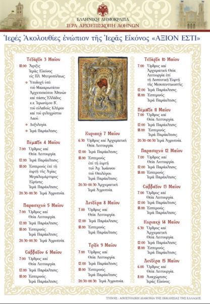 Δείτε το πρόγραμμα με τις Ιερές Ακολουθίες έως και την Δευτέρα 15 Μαϊου, ημέρα κατά την οποία η Ιερά Εικόνα θα αναχωρήσει για το Άγιον Όρος: