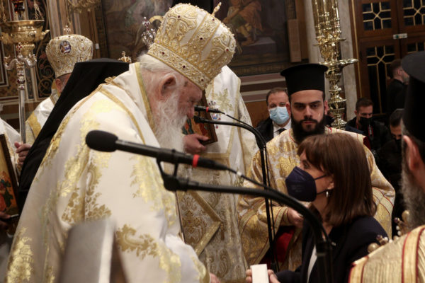 Παρουσία της Προέδρου της Ελληνικής Δημοκρατίας κ. Κατερίνας Σακελλαροπούλου τελέσθηκε σήμερα το πρωί, Α’ Κυριακή των Νηστειών, Συνοδική Θεία Λειτουργία στον Ιερό Μητροπολιτικό Ναό Αθηνών, ημέρα κατά την οποία η Εκκλησία τιμά την αναστήλωση των Ιερών Εικόνων, η οποία καθιερώθηκε το 843 από την Αυτοκράτειρα Θεοδώρα, τον Υιό της Μιχαήλ τον Γ’ και τον Πατριάρχη Κωσταντινουπόλεως Μεθόδιο τον Ομολογητή.