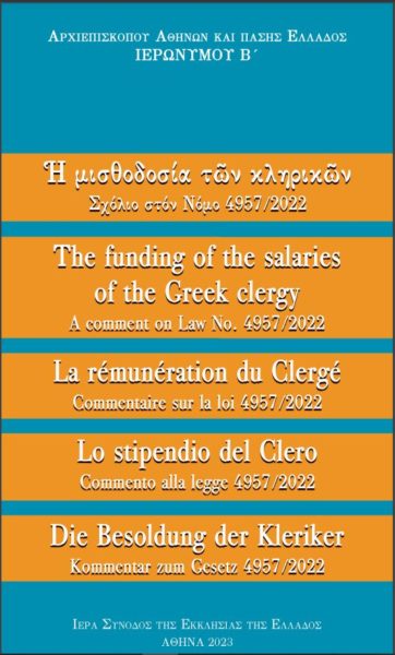 Η Διαρκής Ιερά Σύνοδος, μέσω του τομέα Εκδόσεων της Αποστολικής Διακονίας, εξέδωσε έντυπο σε πέντε γλώσσες του Μακαριωτάτου Αρχιεπισκόπου Αθηνών και πάσης Ελλάδος κ.κ. Ιερωνύμου, με τίτλο: «Η μισθοδοσία των κληρικών. Σχόλιο στον Νόμο 4957/2022».