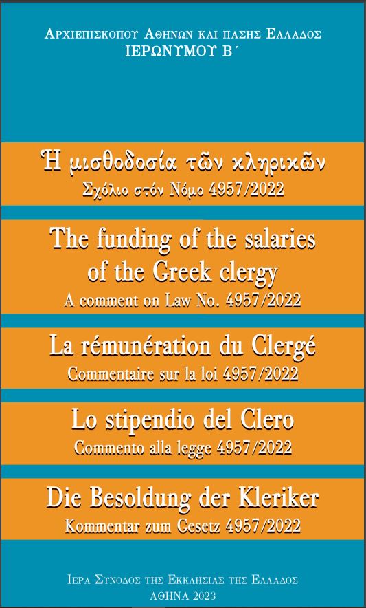 ΜΕΤΑ ΑΠΟ ΠΑΡΕΛΕΥΣΗ πολλῶν ἐτῶν, βρισκόμαστε στήν εὐχάριστη θέση νά ἔχει πλέον ψηφισθεῖ ἡ ἐπικαιροποίηση τῶν ὀργανικῶν θέσεων τῶν κληρικῶν μέ τόν Ν. 4957/2022 γιά τή Μισθοδοσία τοῦ Κλήρου. Ἐπρόκειτο γιά μία ὑποχρέωση τῆς Ἑλληνικῆς Πολιτείας πρός τούς κληρικούς τῆς πατρίδας μας. Τό ζήτημα τῆς «βελτίωσης τῆς καταστάσεως» τοῦ Κλήρου ἐξ ἄλλου τέθηκε ἀμέσως μετά τήν ἀπελευθέρωση τοῦ 1821, ἀλλά ποτέ δέν ὑλοποιήθηκε στήν πληρότητά του. Ἀντ’ αὐτοῦ συνάντησε πολλά ἐμπόδια μέχρι σήμερα, ἄγνωστα σέ πολλούς, τά ὁποῖα περιέγραψα ἀναλυτικά μέσα στήν Εἰσήγησή μου στήν Ἱεραρχία τῆς 4ης Ὀκτωβρίου 2022. Ἡ μισθοδοσία τῶν κληρικῶν τέθηκε γιά πρώτη φορά στήν Ἐπαναστατική καί Ὀθωνική περίοδο, ὡς ἐλάχιστη ἀναγνώριση ἐκ μέρους τῆς Πολιτείας γιά τή συμβολή τοῦ κλήρου στή διατήρηση τῆς ἐθνικῆς συνειδήσεως στά σχεδόν 400 χρόνια σκλαβιᾶς καί στήν Ἐπανάσταση τοῦ 1821. Αὐτό τό ἱστορικό ἔκρινα σκόπιμο ὅτι εἶναι ἀπαραίτητο νά κυκλοφορήσει εὐρύτερα, γιά τήν πληρέστερη ἐνημέρωση ὅσο τό δυνατόν περισσοτέρων ἀνθρώπων, ὥστε νά μήν παραπλανῶνται οἱ ἴδιοι ἀλλά καί νά μήν παραπλανοῦν τούς ἄλλους. Ἡ ψήφιση τοῦ προαναφερθέντος νόμου, πού ὑπῆρ ξε ἀποτέλεσμα συνεργασίας καί συμφωνίας τῶν δύο με – ρῶν, δείχνει πόσο ἀποτελεσματικό εἶναι ὅταν ἡ Ἐκκλησία καί ἡ Πολιτεία προσέρχονται σέ διάλογο μέ καλή διάθεση καί ἀμοιβαῖο σεβασμό. Ἡ ἀρχή τῆς συναλληλίας ἐξ ἄλλου εἶναι ἡ δοκιμασμένη λειτουργική ὁριοθέτηση τῶν σχέσεων Πολιτείας καί Ἐκκλησίας, ἡ ὁποία γιά πρώτη φορά καταγράφεται κατά τήν ἐποχή τοῦ αὐτοκράτορα Ἰουστινιανοῦ. Σέ αὐτό τό πλαίσιο ὁριοθέτησης εἶναι δυνατή ἡ διευ – θέτηση καί ἡ ἐπίλυση χρονιζόντων προβλημάτων, ἀλλά 7 ΠΡΟΛΟΓΟΣ καί ἡ ὅποια ἀνάγκη ἀναθεώρησης καί ἀναπροσαρμογῆς τυχόν χρειασθεῖ. Ἡ ἀρχή τῆς συναλληλίας εἶναι μία δυναμική καί ὄχι στατική ὁριοθέτηση. Ὅταν αὐτή ἡ ἀρχή λειτουργεῖ, μόνο καλά ἀποτελέσματα μπορεῖ νά ἐπιφέρει.