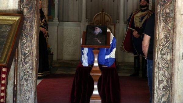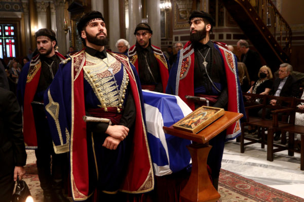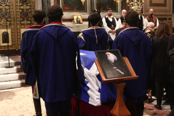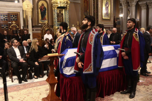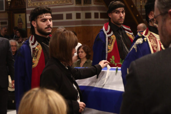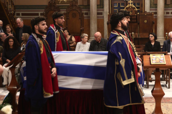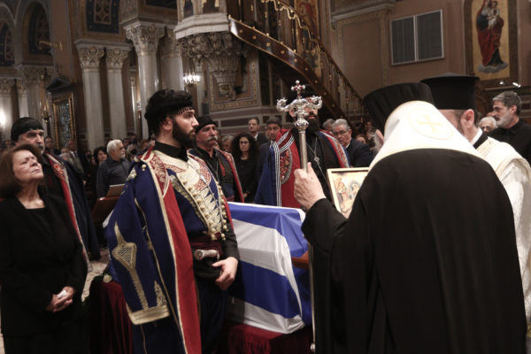 Το φέρετρο βγήκε από τη Μητρόπολη Αθηνών σκεπασμένο με την ελληνική σημαία και το συνόδευαν οι Κουρήτες ντυμένοι με τοπική φορεσιά.
