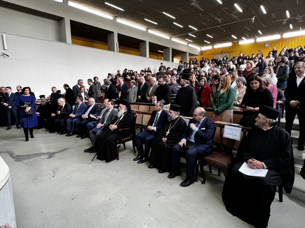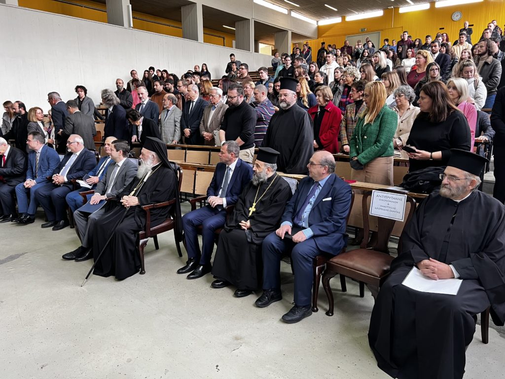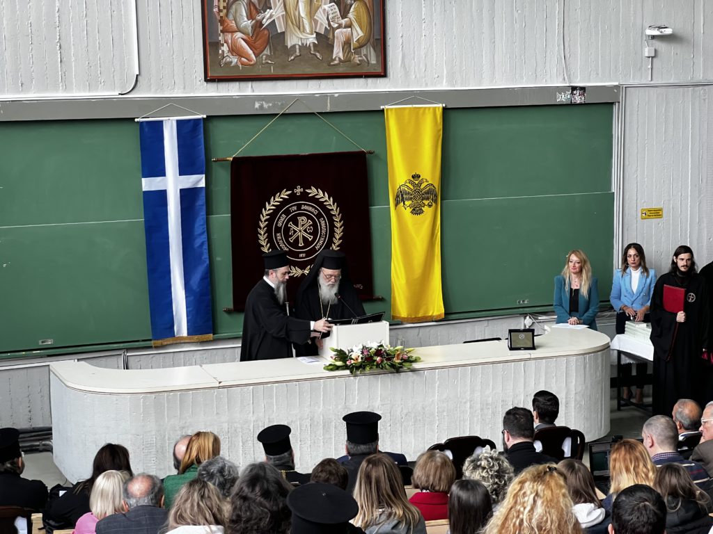Στην συνέχεια χαιρετισμό απηύθυναν ο Κοσμήτωρ της Θεολογικής Σχολής, Καθηγητής κ. Εμμανουήλ Καραγεωργούδης, ο Πρόεδρος του Τμήματος Θεολογίας, Καθηγητής κ. Δημήτριος Μόσχος και ο Πρόεδρος του Τμήματος Κοινωνικής Θεολογίας και Θρησκειολογίας, Μητροπολίτης Κρήνης και Πατριαρχικός Έξαρχος Μελίτης, Καθηγητής κ. Κύριλλος. Αμέσως μετά πραγματοποιήθηκε η επίδοση τιμητικής πλακέτας στην αφυπηρετήσασα Καθηγήτρια κ. Ιωάννα Στουφή-Πουλημένου και στο τέλος της εκδήλωσης ο Αρχιεπίσκοπος μοίρασε συμβολικά σε κάθε φοιτήτρια/φοιτητή μία Καινή Διαθήκη, ενώ ακολουθήσαν ύμνοι από τη χορωδία της Θεολογικής Σχολής.