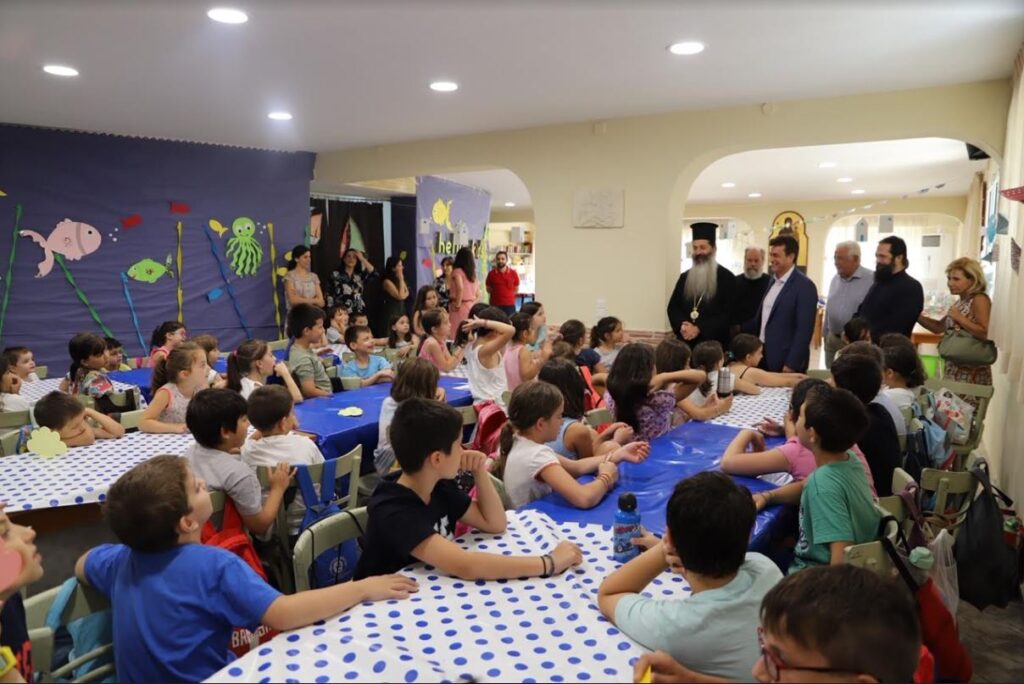 Την τελευταία ημέρα του προγράμματος, Παρασκευή 19 Ιουλίου, επισκέφθηκε τα παιδιά ο Θεοφιλ. Επίσκοπος Θεσπιών κ. Συμεών, Πρωτοσύγκελλος της Ι. Αρχιεπισκοπής Αθηνών. Ο Θεοφιλέστατος μετέφερε στα παιδιά και στα Στελέχη του προγράμματος τις πατρικές ευχές του Μακαριωτάτου Αρχιεπισκόπου μας κ. Ιερωνύμου, άκουσε τα τραγούδια των παιδιών, θαύμασε τις δημιουργίες τους, διασκέδασε μαζί τους και μοίρασε σε όλους αναμνηστικά. Στο σύντομο χαιρετισμό του αναφέρθηκε στην ανάγκη ενότητας και σύσφιξης των σχέσεων αληθινής αγάπης και κατανόησης, προκειμένου να υπάρξει η κοινότητα, με ανθρώπινο πρόσωπο και ουσιαστικές σχέσεις. Τόνισε ότι εκείνο που χαροποιεί δεν είναι κυρίως ο τόπος αλλά ο τρόπος, και πως ακόμη και μέσα σε μια πολύ μεγάλη πόλη, όπως είναι η Αθήνα, μπορούμε μέσα στην Εκκλησία να διασώσουμε την ανθρωπιά και να βιώσουμε την αληθινή κοινότητα και γνήσιες διαπροσωπικές σχέσεις. Αυτά όλα τα συναισθήματα έζησαν τα παιδιά στις 5 εβδομάδες που διήρκησε το «Δημιουργικό καλοκαίρι» μέσα στην αγάπη της Εκκλησίας για όλα τα παιδιά.