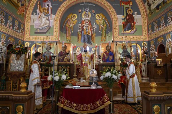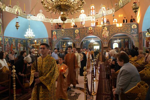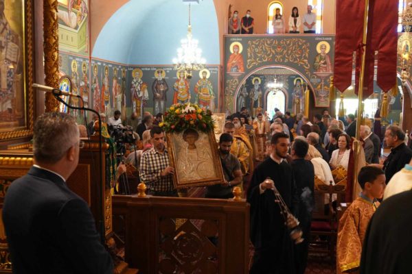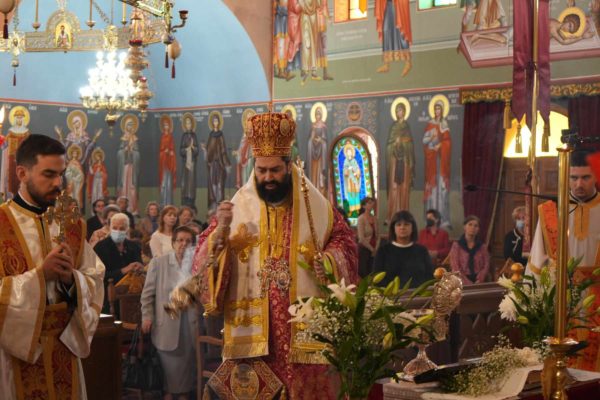 Εν συνεχεία εντός του ιερού ναού πραγματοποιήθηκε λιτάνευση της Ιεράς Εικόνας της Παναγίας Εσφαγμένης και ιερών λειψάνων ενώ ευλογήθηκε το ιερό κόλλυβο του Αγίου Γεωργίου. Πριν την απόλυση της Θείας Λειτουργίας ο Προϊστάμενος του Ιερού Ναού και Αρχιερατικός Επίτροπος της ΙΗ’ Αρχιεπισκοπικής Περιφέρειας, Αρχιμανδρίτης π. Αλέξιος Γιαννιός, ευχαρίστησε τον Θεοφιλέστατο κ. Χρυσόστομο για την παρουσία του στην λαμπρή αυτή ημέρα για την Ενορία. “Ο Άγιος Γεώργιος να σας πραστατεύει και να είναι ο έφορος και προστάτης της ζωής σας”, ευχήθηκε και προσέφερε σε ανάμνηση της επισκέψεως του Θεοφιλεστάτου ένα από τα αναθυμητικά που είχαν εκδοθεί κατά τα εγκαίνια του ναού.