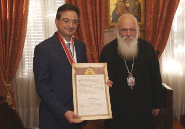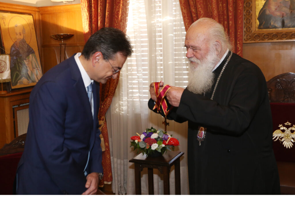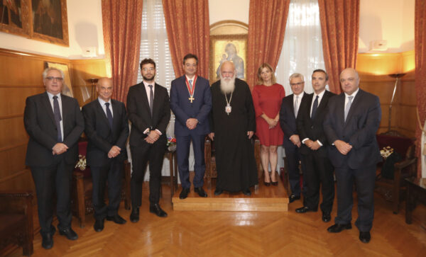 Με το μετάλλιο της Ά τάξεως του Αγίου Διονυσίου του Αρεοπαγίτου, την ανώτατη τιμητική διάκριση της Ιεράς Αρχιεπισκοπής Αθηνών, τίμησε σήμερα το απόγευμα ο Αρχιεπίσκοπος Αθηνών και πάσης Ελλάδος κ. Ιερώνυμος τον Διευθύνοντα Σύμβουλο της Eurobank κ. Φωκίωνα Καραβία για την στήριξή του στην Εκκλησία.