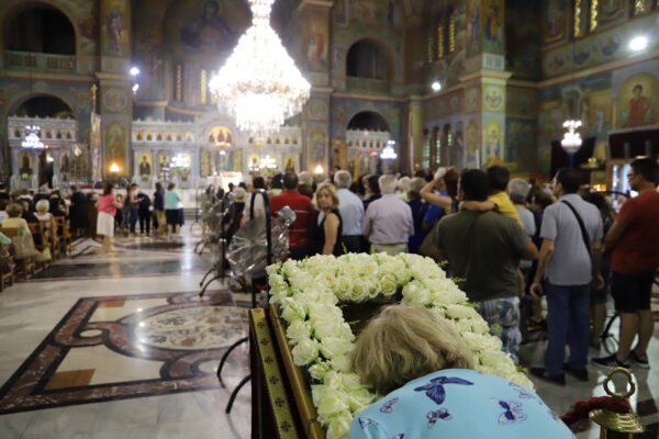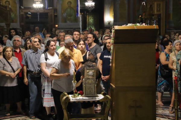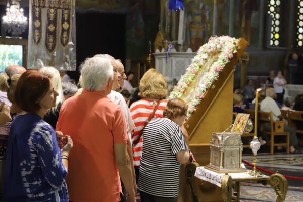 Πλήθος κόσμου, σε συνεχή ροή, προσκυνούσαν τα λείψανα και την εικόνα του Αγίου Παντελεήμονος που δέσποζε στο κέντρο του επιβλητικού ναού.