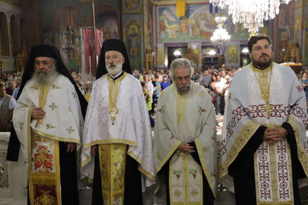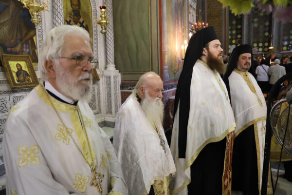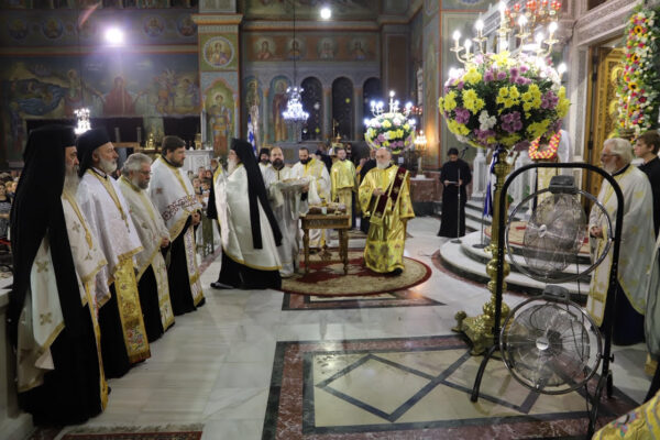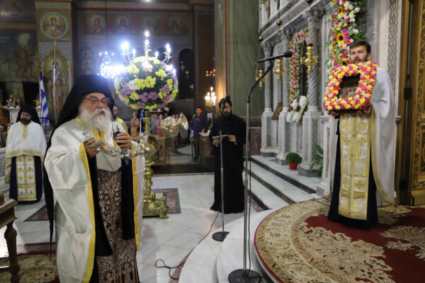 Ο προϊστάμενος του ιερού ναού, Αρχιμανδρίτης Νικόλαος Κατσαφαρόπουλος, ευχαρίστησε τον εορτάζοντα Μητροπολίτη για την παρουσία του στον Εσπερινό και ευχήθηκε καλή επισκοπική πορεία.