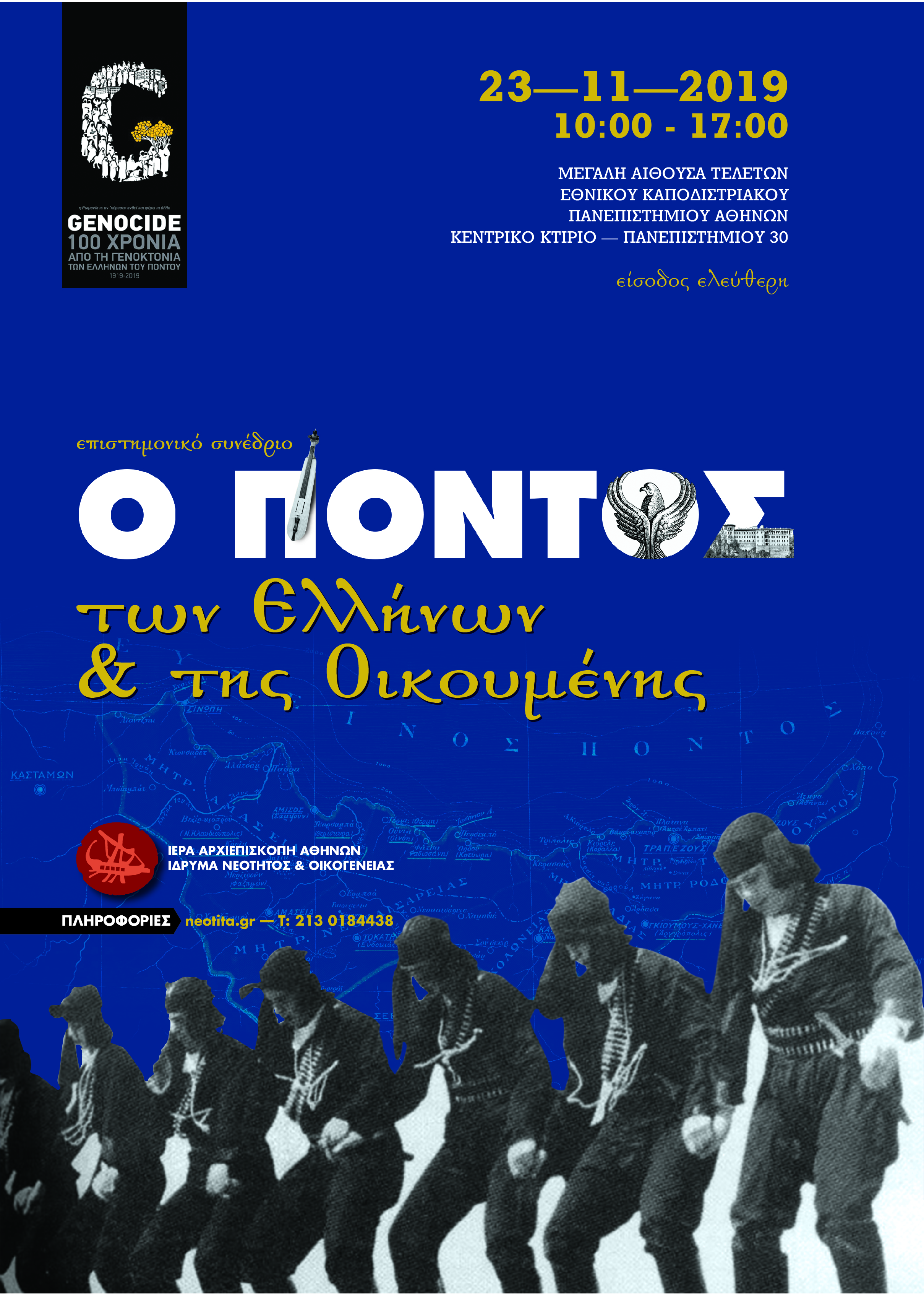 Tο Ίδρυμα Νεότητος και Οικογένειας της Ι. Αρχιεπισκοπής Αθηνών πραγματοποιεί διεθνές επιστημονικό Συνέδριο, υπό τον τίτλο «Ο Πόντος των Ελλήνων. Ο Πόντος της οικουμένης», το Σάββατο 23 Νοεμβρίου 2019, στη μεγάλη Αίθουσα Τελετών του Πανεπιστημίου Αθηνών (Πανεπιστημίου 30, Αθήνα).