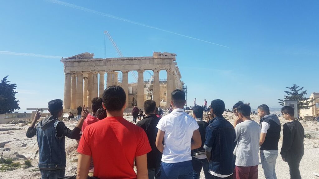 Το προσωπικό της «Εστίας» ξενάγησε τα παιδιά στον Ιερό Βράχο της Ακρόπολης και στους αρχαίους ναούς. Οι ανήλικοι φιλοξενούμενοι πρόσφυγες έμαθαν για την ιστορία της Αρχαίας Αθήνας, εντυπωσιάστηκαν από το μέγεθος των ιστορικών μνημείων και κυρίως από τον τρόπο με τον οποίο χτίστηκαν 2.500 χρόνια πριν.