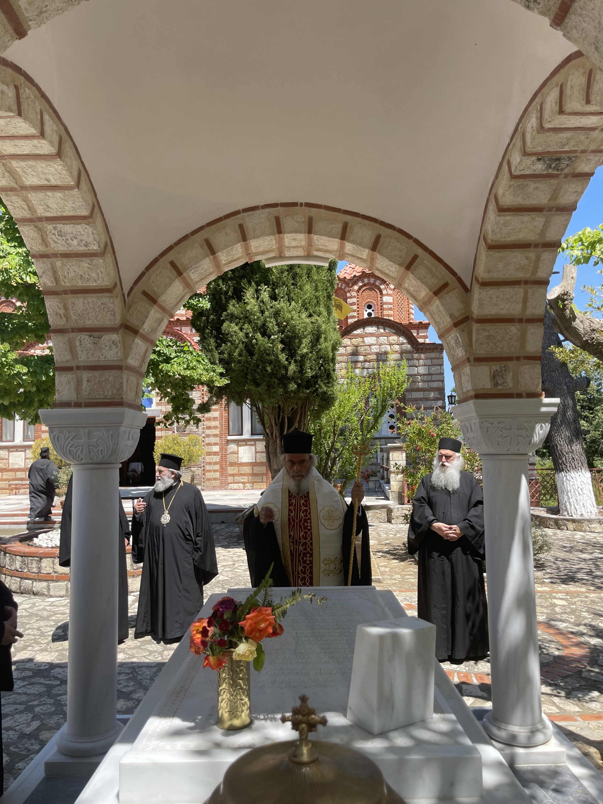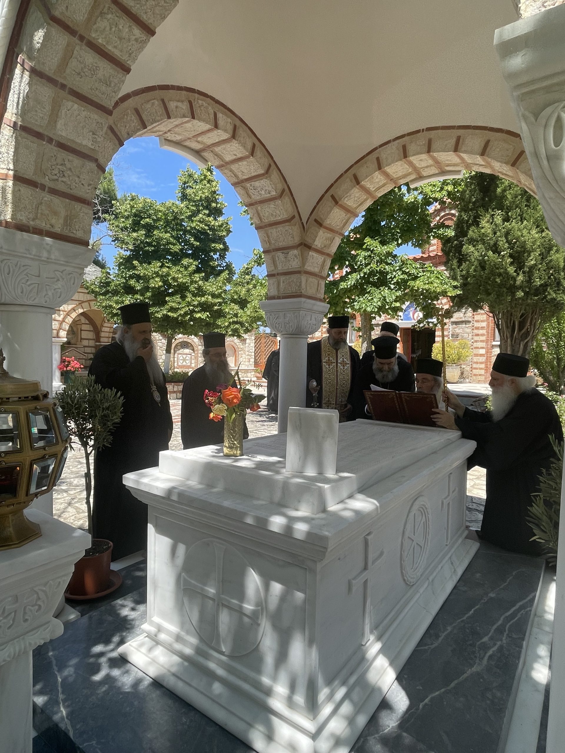Μετά την μοναστηριακή τράπεζα, στο Καθολικό της Ιεράς Μονής, εψάλη η προβλεπόμενη δέηση και αμέσως μετά ο Σεβασμιώτατος Μητροπολίτης Ζιχνών και Νευροκοπίου κ. Ιερόθεος, με την παρουσία των Συνοδικών Αρχιερέων τέλεσε νεκρώσιμο Τρισάγιο επί του τάφου του αοιδίμου κτήτορος της Ιεράς Μονής, Αρχιμανδρίτου Χριστοδούλου.