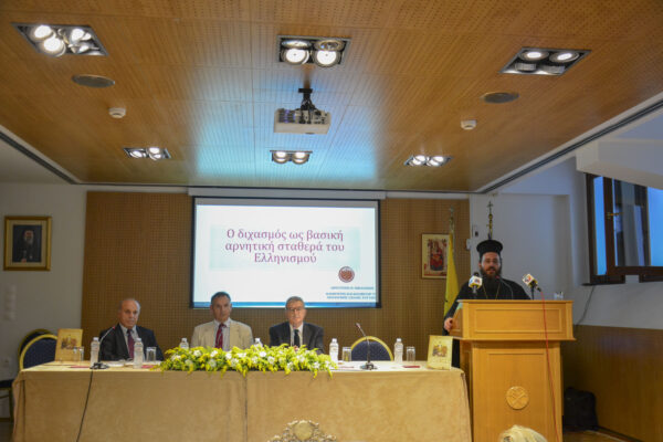 Ο πρώτος εισηγητής, Ελλογιμώτατος κ. Απόστολος Νικολαΐδης, ανέπτυξε το θέμα: «Η διχόνοια ως βασική αρνητική σταθερά του Ελληνισμού». Ο Ελλογιμώτατος αναφέρθηκε στους λόγους που οδηγούν τους Έλληνες στη διχόνοια. Έκανε απολογισμό των συνεπειών της στα εθνικά ζητήματα, την κοινωνία καί τους Έλληνες, παραπέμποντας τόσο στην ιστορική καί κοινωνική εμπειρία, όσο καί σε γνώμες των αρχαίων φιλοσόφων καί εκκλησιαστικών συγγραφέων. Τέλος έκανε περιγραφή των τρόπων υπέρβασης καί οικοδόμησης της εθνικής ομόνοιας.