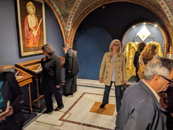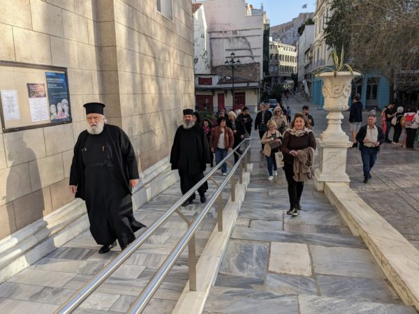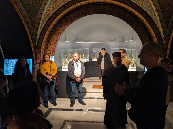 Οι εκπαιδευτικοί είχαν την ευκαιρία να ξεναγηθούν και να πληροφορηθούν για την σπουδαία ιστορία του Μητροπολιτκού Ναού Αθηνών από τον Αιδεσιμολογιώτατο π. Θωμά Συνοδινό, προϊστάμενο του Καθεδρικού Ναού. Η επίσκεψη περιελάμβανε ειδική ξενάγηση στην μοναδική έκθεση ιερών και ιστορικών κειμηλίων στο καινούργιο και επισκέψιμο πλέον κειμηλιοφυλάκιο που βρίσκεται στην παλαιά κρύπτη του Καθεδρικού Ναού.