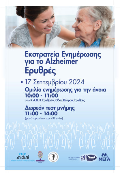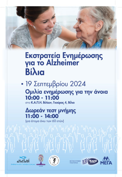 Στο πλαίσιο εορτασμού της Παγκόσμιας Ημέρας Alzheimer την 21η Σεπτεμβρίου 2024 το «Καρέλλειο», η Ολοκληρωμένη Μονάδα Αντιμετώπισης Νόσου Alzheimer του Φιλανθρωπικού Οργανισμού «ΑΠΟΣΤΟΛΗ» της Ιεράς Αρχιεπισκοπής Αθηνών και η εταιρεία «ΜΕΓΑ» διοργανώνουν δράσεις που αφορούν την νόσο Alzheimer.