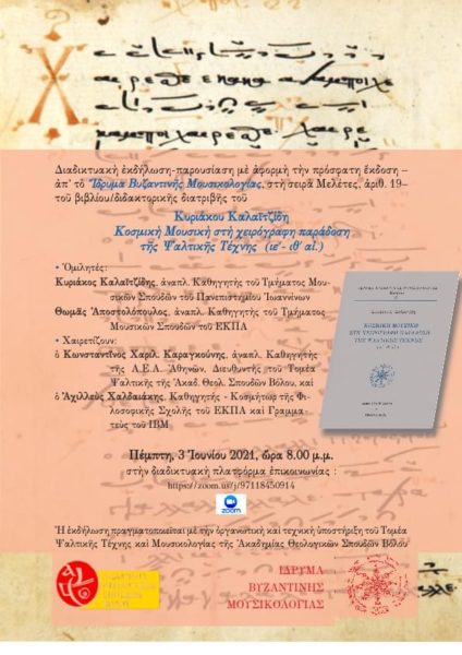 Με αφορμή την πρόσφατη έκδοση από το Ίδρυμα Βυζαντινής Μουσικολογίας (στη σειρά Μελέτες, αριθ. 19) του βιβλίου/διδακτορικής διατριβής του Κυριάκου Καλαιτζίδη «Κοσμική Μουσική στη χειρόγραφη παράδοση της Ψαλτικής Τέχνης (ιε´- ιθ´ αι.)» και με την οργανωτική και τεχνική υποστήριξη του Τομέα Ψαλτικής Τέχνης και Μουσικολογίας της Ακαδημίας Θεολογικών Σπουδών Βόλου, θα πραγματοποιηθεί διαδικτυακή εκδήλωση- παρουσίαση την Πέμπτη, 3 Ιουνίου 2021, ώρα 8 μ.μ.