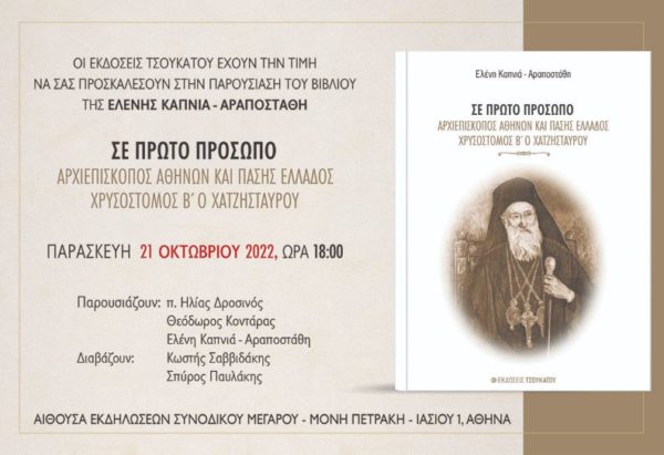 Το βιβλίο της Ελένης Καπνιά – Αραποστάθη “Σε πρώτο πρόσωπο – Αρχιεπίσκοπος Αθηνών και πάσης Ελλάδος Χρυσόστομος Β΄ο Χατζησταύρου” από τις Εκδόσεις Τσουκάτου θα παρουσιαστεί την Παρασκευή 21 Οκτωβρίου 2022, στις 6 το απόγευμα στην αίθουσα Εκδηλώσεων του Συνοδικού Μεγάρου.